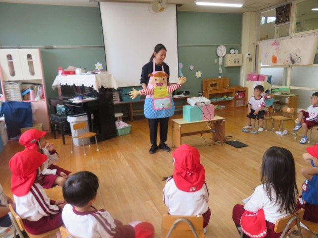 エプロンシアターを使って手洗いの大切さを知り、音楽にあわせて手洗いの練習を行いました。