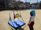 預かり保育の子どもたちが第2グラウンドで遊びました。5歳児が遊んでいた鉄棒に興味...