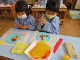 3歳児はクレパスを使って好きな絵をかきました。色も自分で選びながら楽しんでかいて...