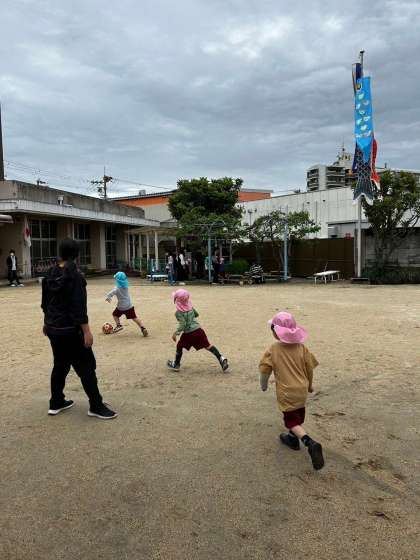 今年度初めての保育参観をしました。雨が心配されましたが、園庭で元気いっぱい遊ぶ子どもたちの様子を見ていただくことができました。サッカーや小麦粉粘土、砂場でのままごと遊び、鯉にエサをあげる…など、好きな遊びを見つけて、先生や友達と関わりながら遊ぶ姿がたくさんありました。