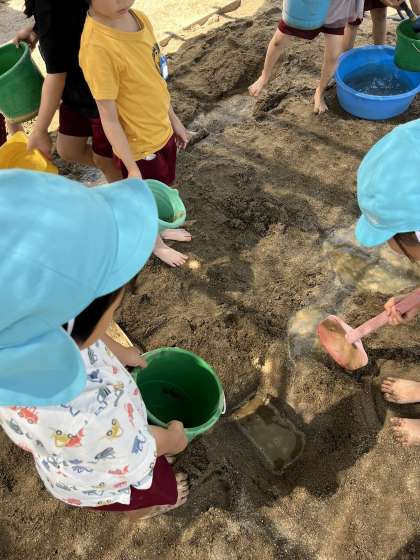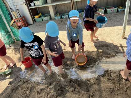 重たい水を運んだり、穴を掘り進めたりと、泥の感触を楽しみながら、体を存分に動かして遊んでいます。