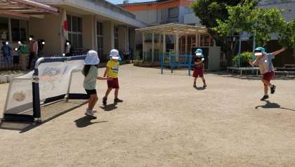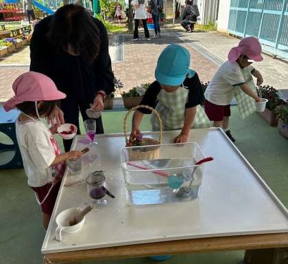 良いお天気に恵まれ、子どもたちが元気いっぱい園庭で遊ぶ姿をおうちの人に見てもらうことができました。砂場での泥んこ遊び、サッカー、幼稚園のお花を使った色水遊びでのジュース屋さん、シャボン玉遊びなど、身近な自然にふれたり、自分の好きな遊びをしたりして楽しでいました。