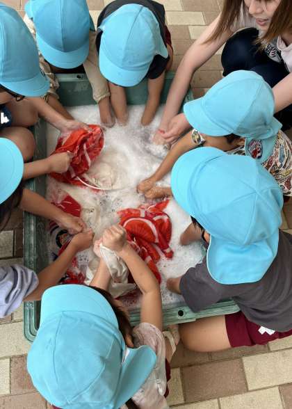 また来年、元気に空を泳げるように、みんなで石鹸を使ってこいのぼりをお洗濯しました。