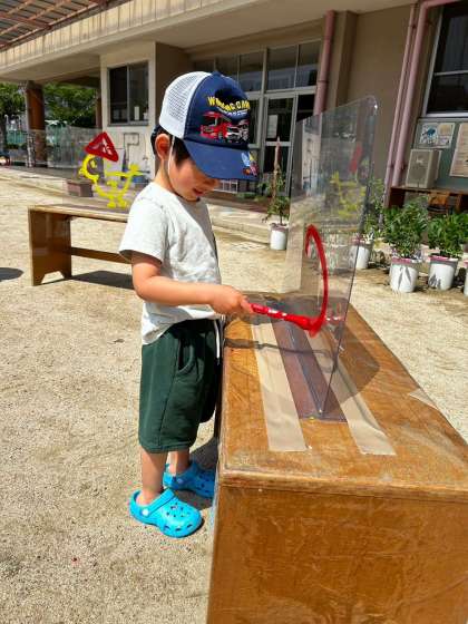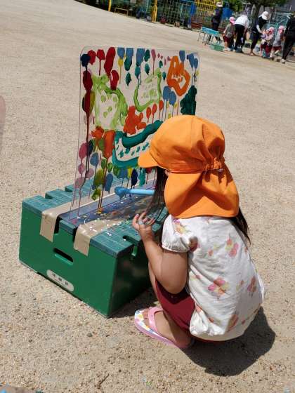 初めて絵の具で絵をかくお友達もいて、透明の板に筆で線を伸ばすと、その楽しさに思わず笑みがこぼれる可愛い姿も!たくさんの色を使ったり、色を重ねたりしながら存分に絵の具の感触を楽しんでいました。