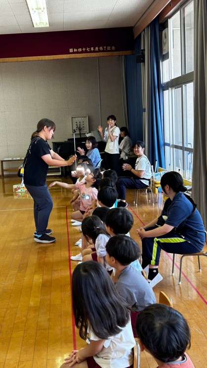 先生たちからのプレゼントでは『あめのちゆうやけ せんたくかあちゃん』のお話をスライドで見ました。洗濯ごっこや泡遊びを楽しんでいる子どもたちにぴったりのお話で、興味をもって見ていました。