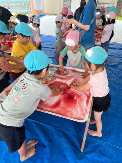 片栗粉からつくったゆび絵の具の柔らかい感触を存分に味わって遊んだ後は、先生やお友達・紙やシートにペタペタとつけて楽しみました。