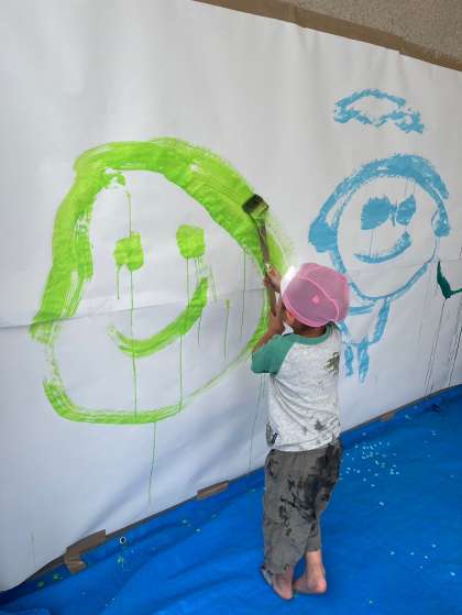 大きな紙を壁や床に広げたところに絵の具で自由にお絵かきもしました。長い筆を使ってダイナミックに描く子、自分のまわりに黙々と好きな絵をかく子、手形・足形をつけながら全身を使って楽しむ子など、表現方法が色々あり、個性も感じられました。