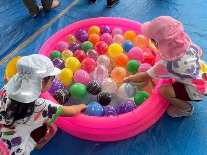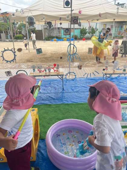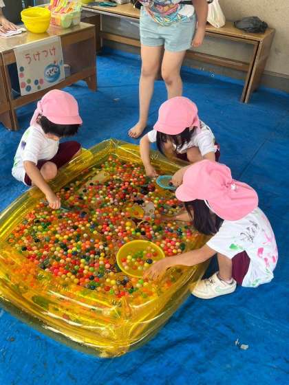 ピロティには、子どもたちが大好きな“ヨーヨー釣り”や“スーパーボールすくい”、さくら組さんがつくった可愛らしい的が並ぶ“水鉄砲”の遊びがありました。