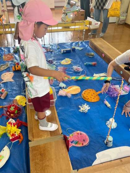 室内にもワクワクする遊びがいっぱいです。さくら組さんがつくった魚たちが泳ぐ“魚釣り”は時間を忘れて夢中になる楽しさ!