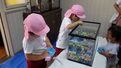 園長先生のお部屋には、海の世界が広がる“コイン落とし”があり、カラフルなおはじきが器に入るか何度も挑戦していました。