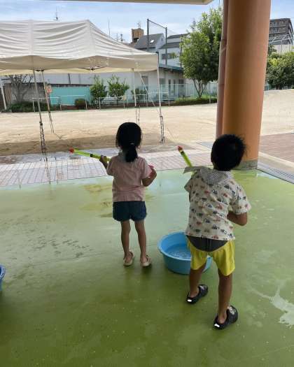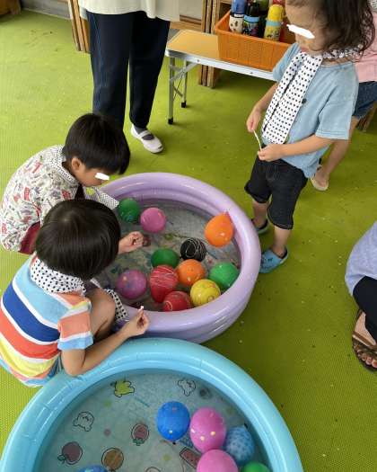 今日は少し外が涼しいので、ピロティーでスーパーボールすくいやヨーヨーつり、水鉄砲をして遊んでいます♪