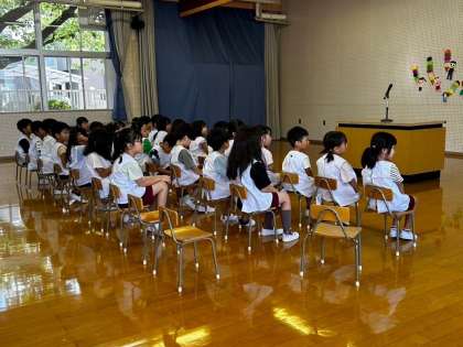 夏休みの間に主事さんがワックスをかけて、ピカピカの床になった遊戯室で始業式をしました。