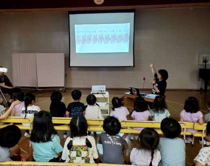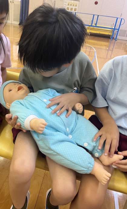 まず最初に、ハートの画用紙を配りました。そのハートを空にかざすと小さな点が見えます。「みんなの生命の始まりはこんなに小さな点なんだよ」と伝えました。お腹の中で、赤ちゃんがどのように成長していくのかも知らせ、お母さん先生への質問タイム!子どもたちからはたくさんの質問がでました!その後は、保育人形Babyにも登場してもらい、抱っこ体験をしました。赤ちゃんの抱っこに慣れている子どもや、恐る恐る抱っこする子どももいましたよ。みーんな愛されて、大切に育てられている事を伝える絵本を読み、最後は、お母さん先生のお腹を優しく触らせてもらいました。みんなの心がほっこり温かい気持ちになりました。