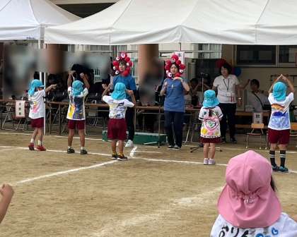 エンディングでは、2025年に開催される大阪関西万博のキャラクターミャクミャクに変身した先生が登場し、お家の方や来賓のお客様も一緒に『この地球の続きを』のダンスを踊りました。