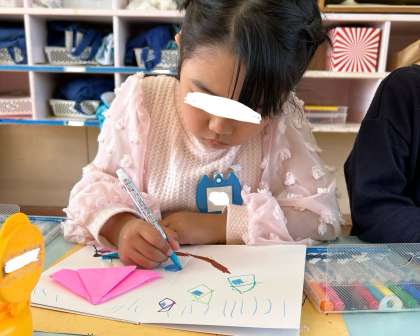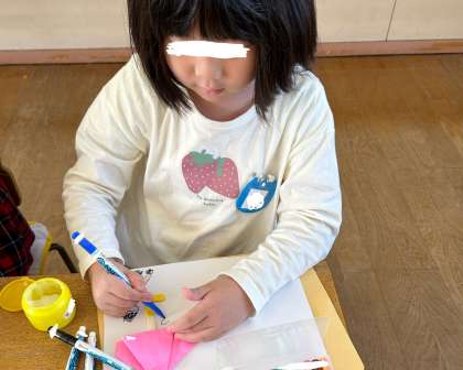 その折り紙を使って周りに絵をかき、世界に一つだけの絵本づくりをしています。