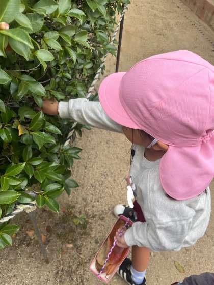 「この葉っぱ柿の匂いがするよ」「こっちにかわいいお花があるよ」などとみんなで楽しみながら探していました。