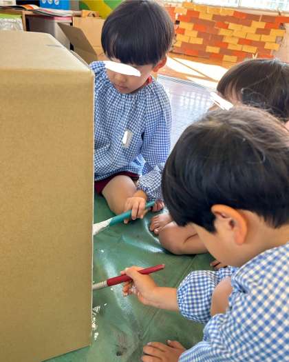 「お城はすごーく大きいからね」「段ボールを積んで高くしたらいいんじゃない?」と相談しながら、段ボールに色を塗ったり、敵がやって来ないように城壁づくりをしたりしました。