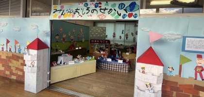 そら組さんは絵本『おしゃべりなたまごやき』の世界をつくりました。王様の座る椅子、お城、にわとりごやを共同製作しました。お城になにがあれば楽しいかな?どんなお城に住みたいかな?と考えて、お家から持ち寄った素材を使ってつくり、「みんなのお城の世界」ができあがりました!