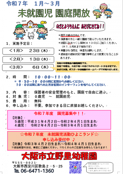 未就園児園庭開放(1,2,3月)のお知らせ 公開日 2024/12/25 更新日 2024/12/25 お知らせ 1,2,3月の未就園児園庭開放の日程が決まりました。 当日、中止の場合はホームページにてお知らせします。 幼稚園に遊びに来てくれるのを待っていますね! いいね(0)