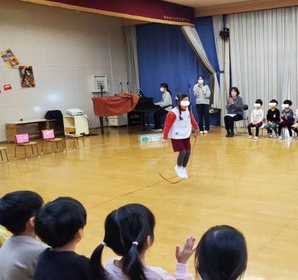 誕生児の子どもたちは、縄跳びやホッピングなどの遊びを披露したり、スキップで元気に入場したりしました。おうちの方から温かいお祝いの言葉をいただきましたよ。