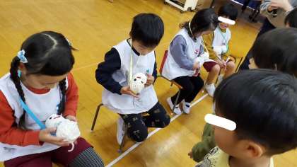 さくら組さんからモコモコの雪だるまの首飾りをプレゼントしてもらいました。先生たちからのプレゼントは寒い季節にぴったりの『ゆげゆげ〜』のお話でした。