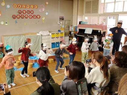 劇遊び「もりのおふろ」では、好きな動物になって背中の洗いっこをしたり、懐かしい昭和の雰囲気が漂う「いい湯だな」の曲に合わせて、♪ババンバ バンバンバン と踊ったりと可愛い姿がたくさん見られました。
