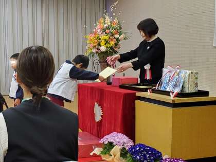 修了式では、園長先生から一人ずつ保育証書をいただきました。おうちの方のほうを向いて「幼稚園で楽しかったこと」や「小学校に行って頑張りたいこと」を言いました。みんなの嬉しそうな誇らしげな表情や、おうちの方のところまで赤い絨毯の上を堂々と歩く姿が印象的でした。
