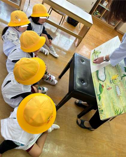 お部屋で『そらまめくんのベッド』の大型絵本の読み聞かせをしてもらっていた子どもたち。