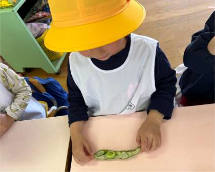 「本当にフワフワしている!」と絵本と実物を見比べたり、実際にそら豆をベッドに寝かせたりして喜んでいる姿が可愛らしかったです。
