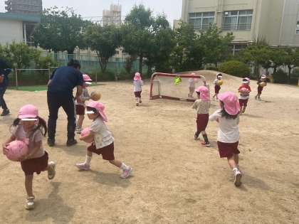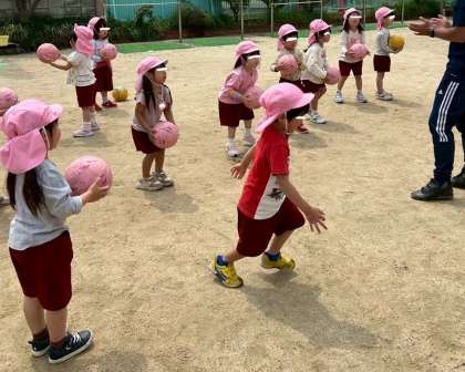さくら組さんは、ボールを持って取られないように走ったり、ボールを投げてキャッチに挑戦したりしました。