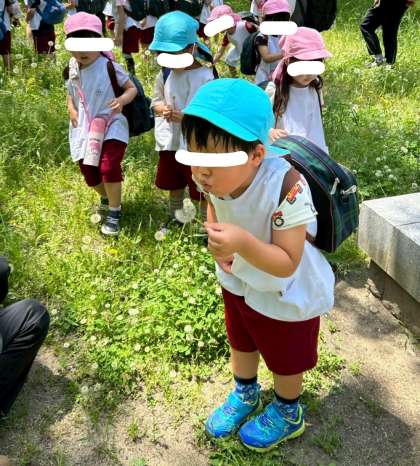 園内を探検しタンポポやツツジ、アメンボなど花や虫を見つけました。