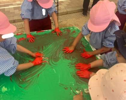 さくら組さんとひよこランドさんで絵の具を触って遊びました。