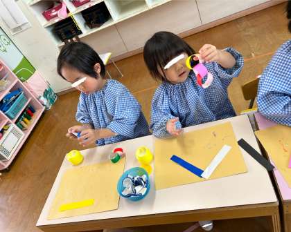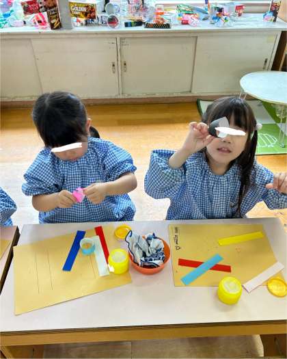 最初は、「難しそう!」と言っていた子どもたちも、一つ、二つと輪を繋げていくと楽しくなってきた様子で、「もっと長〜いのつくるー!」と、集中してつくる姿が見られました。