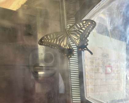 幼稚園で育てていたアゲハチョウの幼虫がさなぎになり、今日さなぎからアゲハチョウに変身していました。
