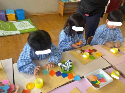 七夕飾りづくり(四角つなぎ、三角つなぎ) 公開日 2025/06/20 更新日 2025/06/20 新規カテゴリ 四角や三角の折り紙をどんどん繋いでいき、飾りをつくりました。 最初はどこにのりつけるのかな?と悩んでいましたが、「見てみてー!」「こんなに繋げたー!」とみんなで嬉しそうに見せ合いながらつくりました。 いいね(0)
