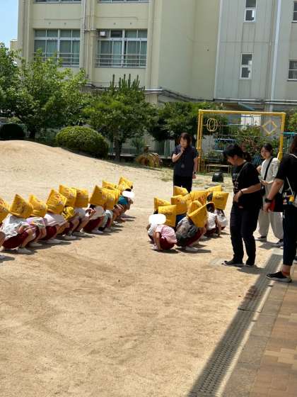 防災頭巾に少し苦戦しながらも全員園庭に避難することができました。