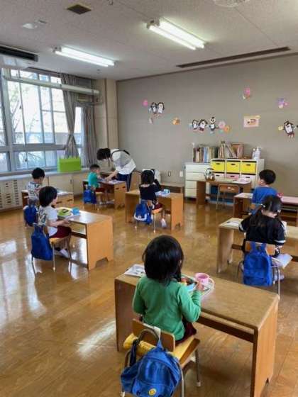 4歳児さくら組さんが、幼稚園で初めてお弁当を食べました。