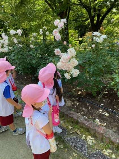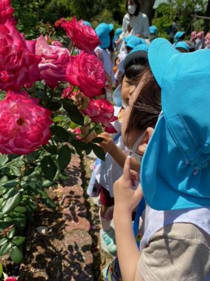 バラ園でバラのお花を見たよ。 「う〜ん、いい香り」