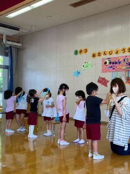プレゼントはこいのぼりペンダント。4歳児さくら組さんがつくってくれたよ。