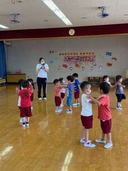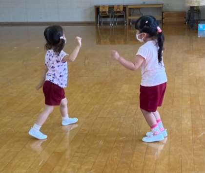 🎵テクテクテクテク歩いてきて…友達と一緒に歌いながら踊って楽しそう。先生が「自分の名前を言い合いっこしようね」と言うと「◯◯ ◯◯です」と、上手に自己紹介もしていましたよ。