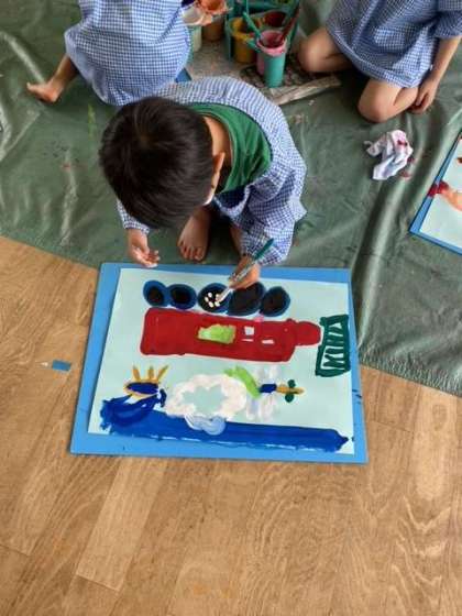 ◯◯くんは、電車の車輪に白い絵の具で点々々…とても集中して丁寧にかいていました。