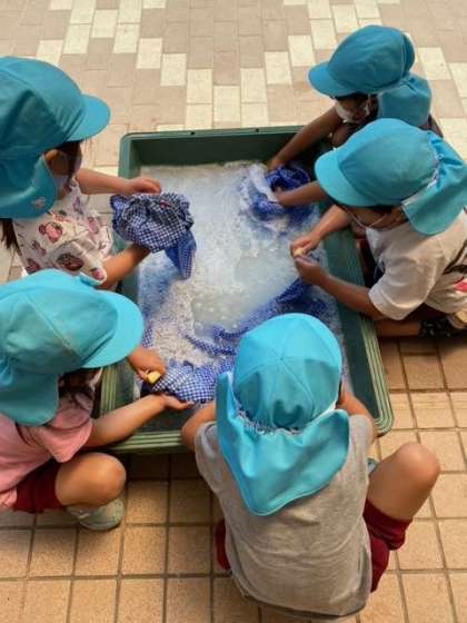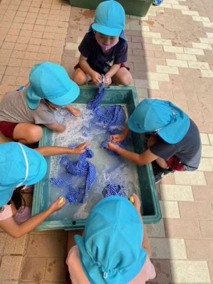 水や泡を触るのが心地よく、いつまでも、お洗濯を楽しんでいました。お家でもお手伝いしてね。
