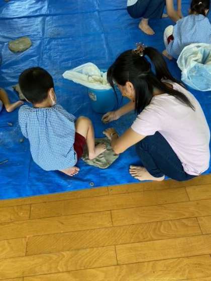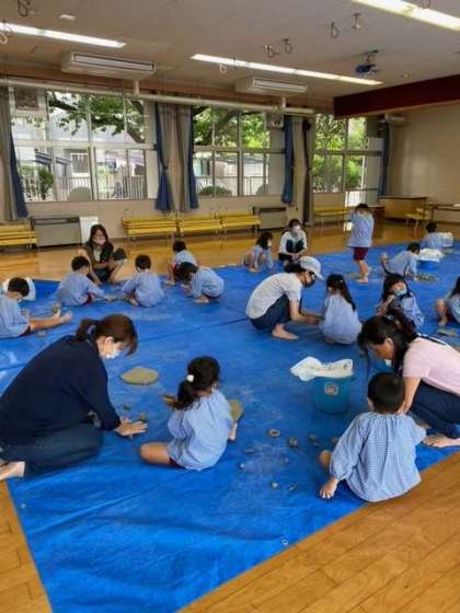 5歳児そら組さんは、土粘土に手を埋めたり足で踏みしめたり、手足で感触を楽しんでいます。