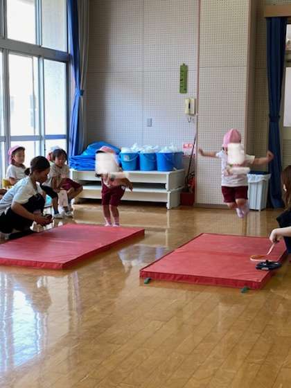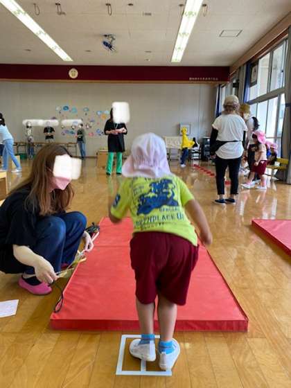 両足で幅跳び。「1.、2の3!」両足でどこまで跳べるかな?
