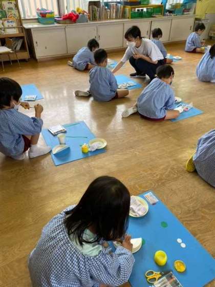 今日は、初めての設定保育です。子どもたちは、カエルのカスタネットをつくりました。