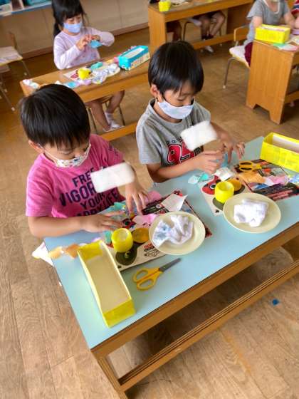 きれいな飾りをつけて、七夕の日の誕生会で、飾りましょうね!