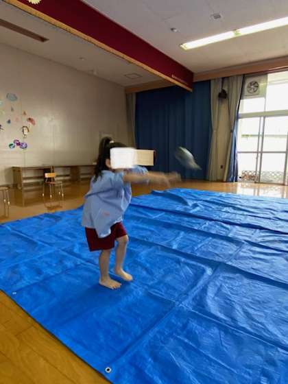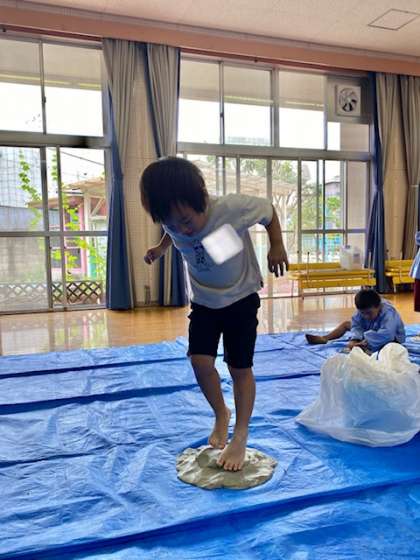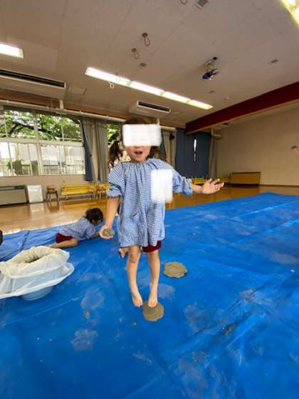 4歳児さくら組は、土粘土で遊びました。裸足で土粘土の上をピョンピョン飛び跳ねて楽しそう!