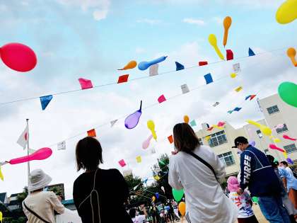創立70周年記念運動会のエンディングは、会場にいる人全員でジェット風船を飛ばしました。コロナ禍でジェット風船をどのように膨らませるのか、事業委員の皆様と相談し、コンプレッサーで膨らませることにしました。