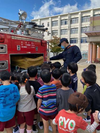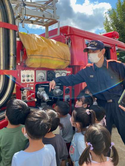 子どもたちの避難訓練、教職員の消火訓練の後、消防車を見せてもらいました。