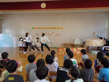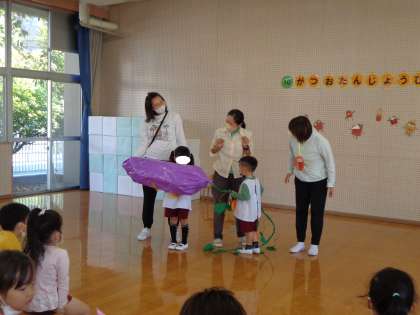 今日は10月生まれのお誕生会でした。先生たちが「大きなおいも」の劇をしました。